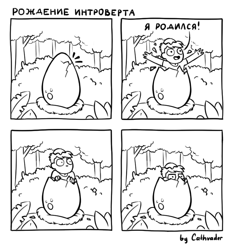 Если среди моих читателей есть интроверты, то сегодняшняя подборка для вас! Сам я тоже отношу себя скорее к этой группе людей - большую часть времени мне нравится проводить вне больших скоплений людей (я даже работаю дома). В целом, среди художников комиксов вообще довольно много интровертов, так что эта тема часто проскальзывает в многочисленных комиксах, циркулирующих в сети. И несколько из таких зарисовок я как раз и собрал сегодня в одном месте. Надеюсь, что вам понравится! Питерская художница Анастасия Киселева, также известная в сети под псевдонимом Cathvader, нарисовала забавный сюжет о том, как интроверты появляются на свет. Выглядит вполне правдоподобно. Американская художница Сара Андерсен (Sarah Andersen) - создательница автобиографичной серии комиксов Sarah's Scribbles («Время мазни») - в своих работах часто шутит про интровертов, к которым она сама также относится. К примеру, в одной из подобных зарисовок Сара решила наглядно показать, чем отличается вклад интровертов и эк