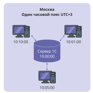 1) С конфигурацией пользователи работают в пределах одного часового пояса. Например, база конфигурации установлена в г.Москва, пользователи, которые работают с ней, находятся в этом же часовом поясе. При этом, у них на компьютерах время может отличаться. И этот факт при разработке программного продукта обязательно нужно учитывать.