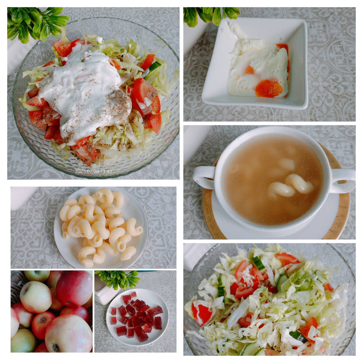 Завтрак - яйцо всмятку в микроволновке; салат из айсберга, помидора, огурца и квашеной капусты с мацони; холодные макароны вместо хлеба; на десерт - мацони с повидлом.