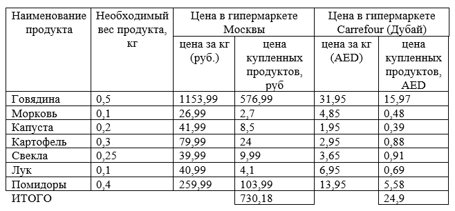 Итак, продукты для борща в Дубае обойдутся дешевле, 25 AED (примерно 665 рублей), чем в Москве, но не стоит сильно радоваться.