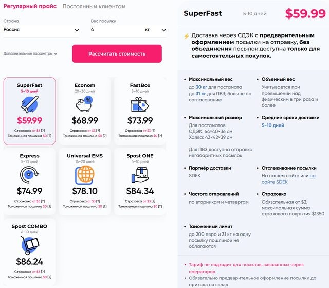 Номер для отслеживания после выкупа в Pochtoy не предоставляют, так что приходится ждать поступления на склад. 19 января посылка поступила на склад, о чём сообщили по электронной почте. Сразу же стал формировать посылку для отправки. Калькулятор показывал стоимость доставки от $68.99. Более дешевая доставка доступна только при самостоятельном выкупе товаров.