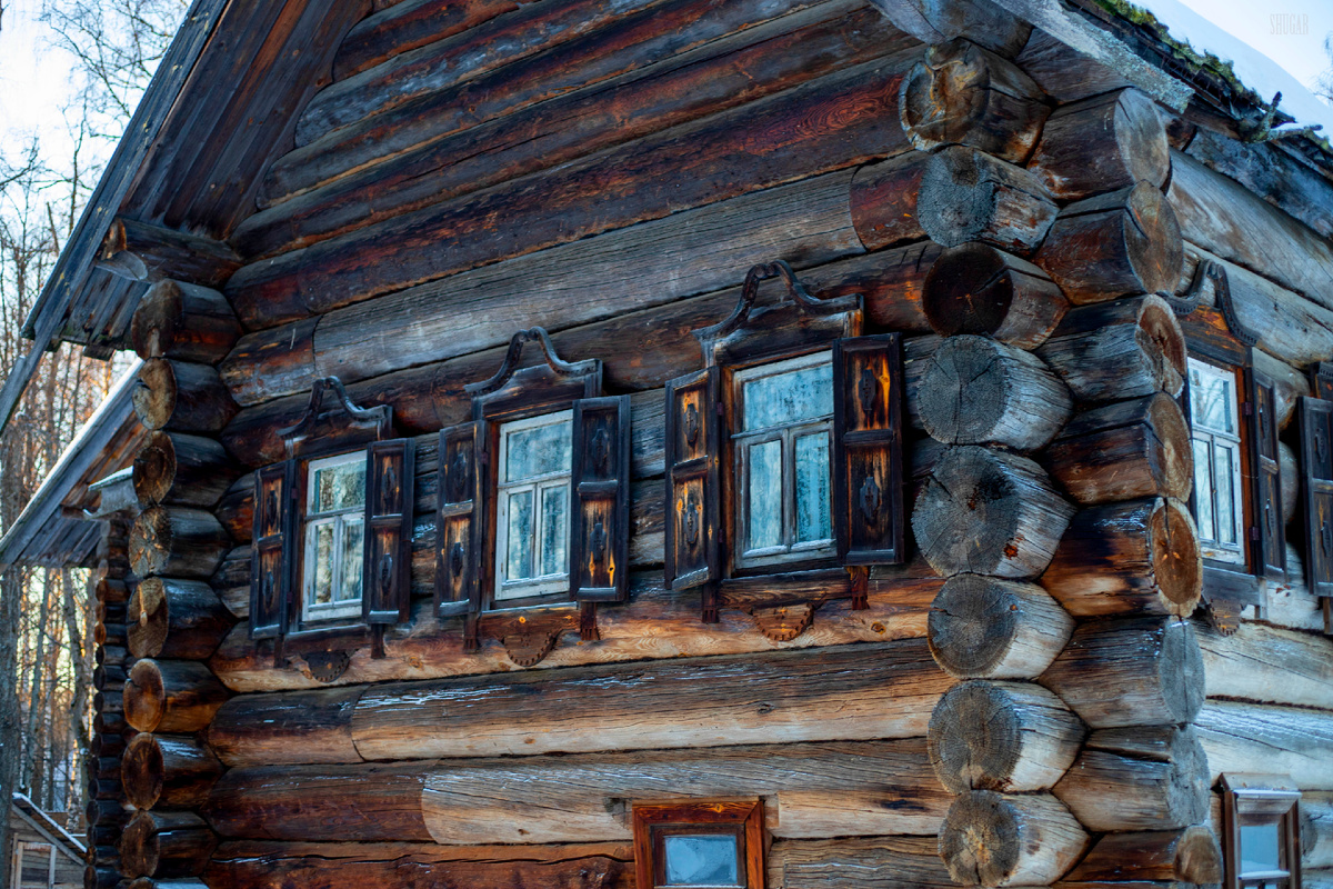 Дом старовера Скобёлкина. Возможно, это самый старый деревянный дом на Верхней Волге, отмечается в описании к нему. Конец XVIII - начало XIX века. Массивные сосновые брёвна - до 60 см в диаметре. Внизу - мастерская хозяина, наверху - жилые комнаты, слева, вплотную к избе - хозяйственные постройки. Впечатление он производит, конечно, мощное.