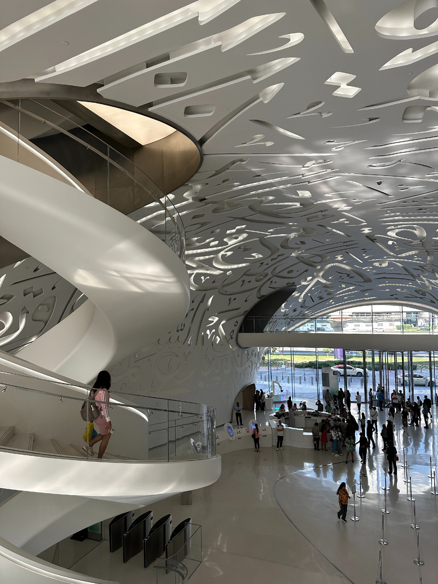 Музей поражает своим дизайном — он выглядит как огромный глаз, что символизирует видение будущего. Снаружи используются стекло и металл, а внутри можно найти стильные и современные выставочные пространства. Фасад музея декорирован резьбой с арабской каллиграфией, а перфорация контуров выполняет функцию своеобразных окон.