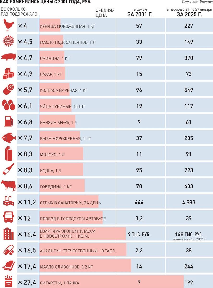 Средние темпы роста составили 9,1% в год, — следует из данных Росстат. Курс доллара вырос в 3,4 раза, цены на жильё — в 16 раз, а пачка сигарет подорожала в 27 раз. Цена на десяток куриных яиц поднялась с 19 до 117 руб., куриное мясо — с 57 до 227 руб. за 1 кг, сливочное масло — с 14 до 244 руб. за пачку 200 гр, а литр 95-го бензина подорожал с 9 до 61 рубля, — пишет СМИ «Российская Газета»