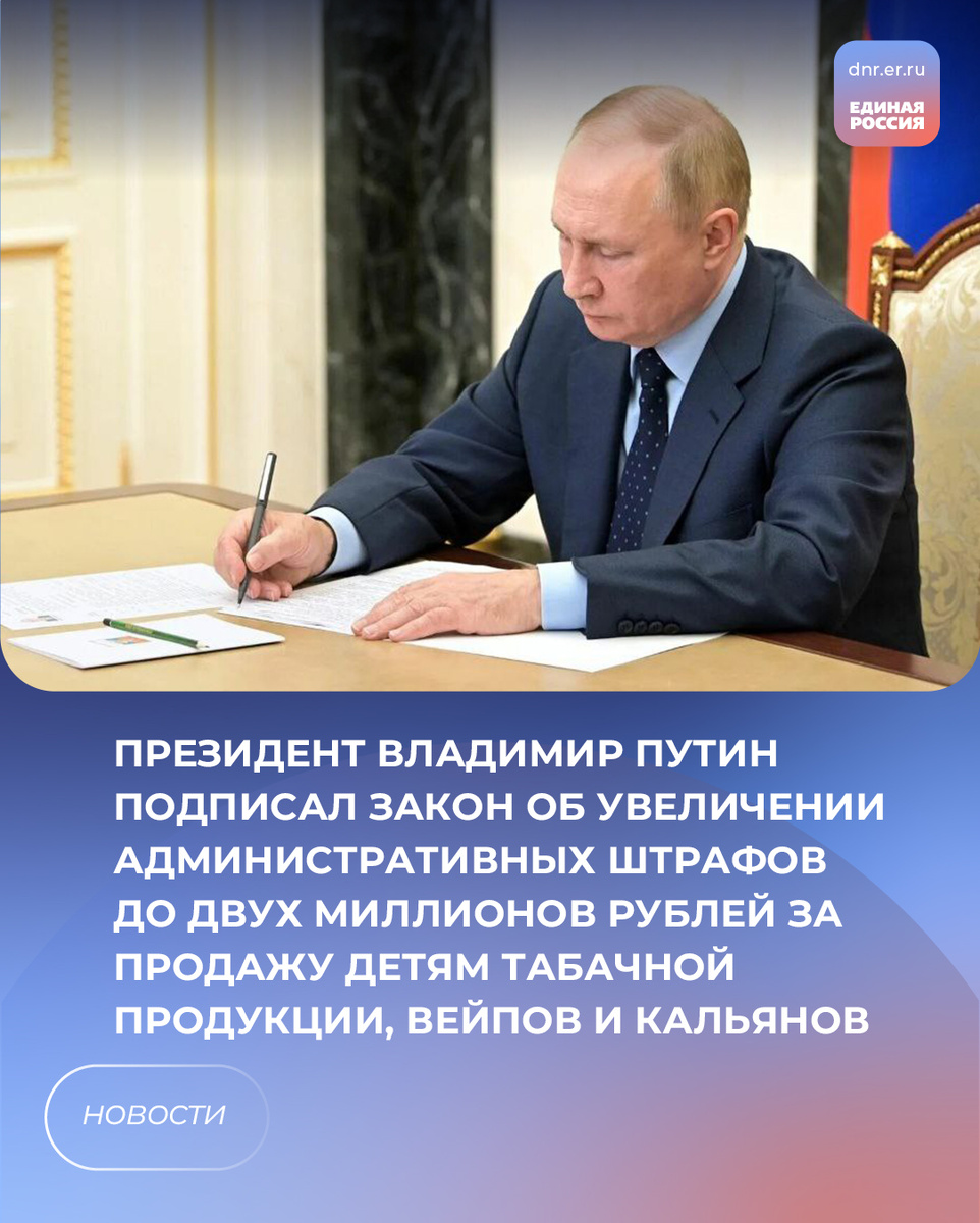🙅♂️Президент Владимир Путин подписал закон об увеличении административных штрафов до двух миллионов рублей за продажу детям табачной продукции, вейпов и кальянов. Соответствующие изменения внесли в административный кодекс.