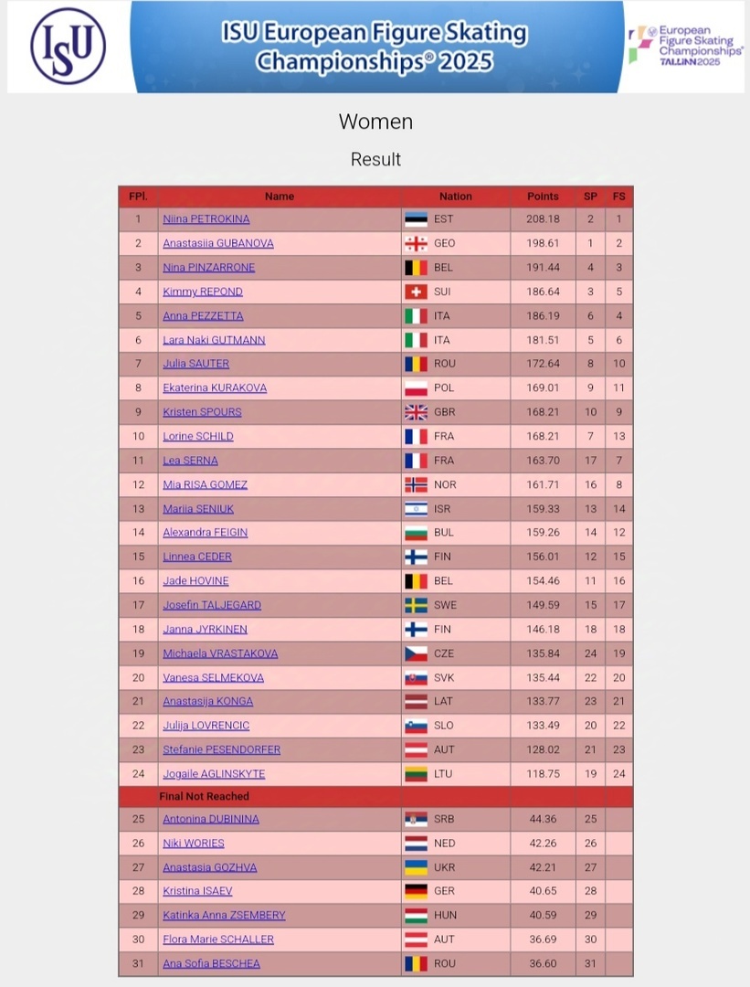 Нина Петрыкина пропустила прошлогодний ЧЕ. При выходе на домашний лед зал встретил ее овациями. Сразу был виден бойцовский характер. Семь тройных прыжков (по нынешним временам это уже можно признавать за ультра-си), каскад 3-2. Споткнулась на ровном месте и упала на коленку, но продолжила дальше как ни в чем не бывало. Отличная крутка на вращениях. Музыка выбрана пробивная и на нее поставлена программа, рассчитанная на победу. Да, не зря такая композиция, она задает нужный настрой. Ну в целом хорошо подготовилась, шанс свой использовала на максимум, недокрутов ей не отметили. Не хватает визуальной доработанности образа в макияже, прическе, хореографичности рук (хотя, о чем это я - это всего навсего только Европа). Оценка - 139.24 балла (208.18). Состоялось триумфальное возвращение и вот новая чемпионка Европы. Интересно будет посмотреть ее на ЧМ, а то там европейские чемпионки не больно котируются.