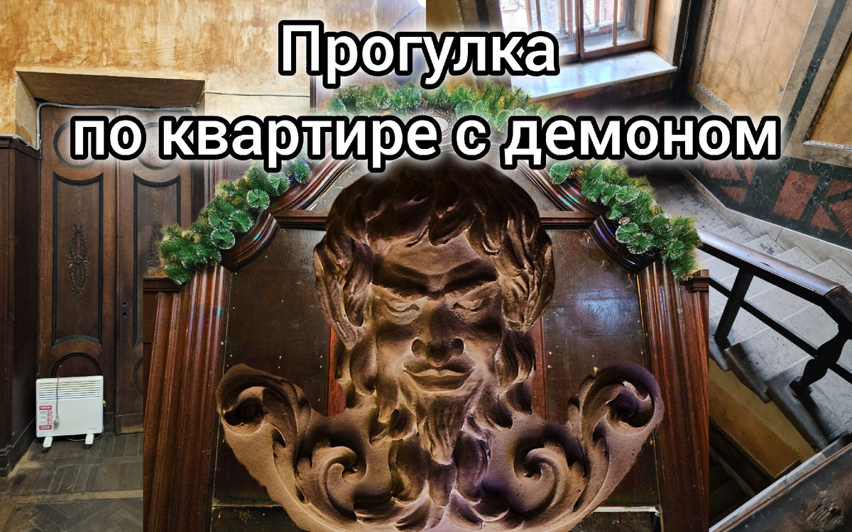 Мы дошли до коммунальной квартиры Станислава. Сразу после входа мы попали в холл, отделанный деревянными панелями. На потолке можно было увидеть лепнину и розетку. И лицо, несколько напоминающее демона...