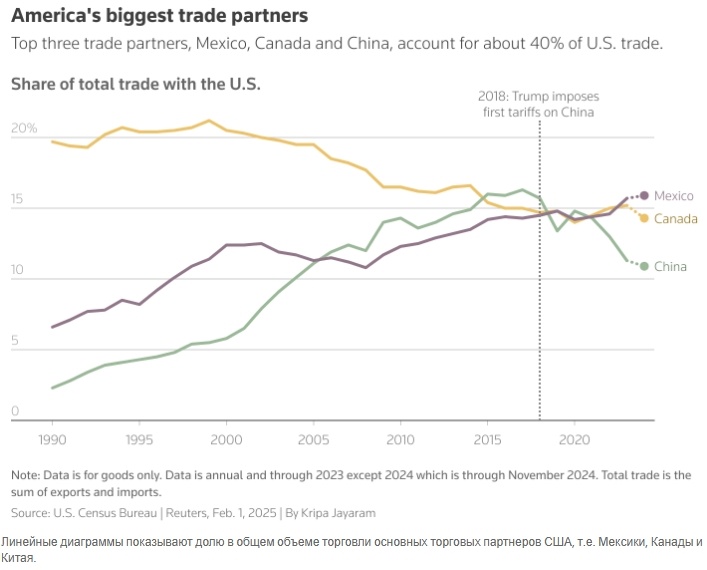 В выходные президент США объявил о введении дополнительных пошлин в размере 25% на импорт из Мексики и большинство товаров из Канады, а также 10% на товары из Китая. Это решение вызвало потрясение на рынках, которые ранее считали, что Трамп в основном блефует и просто хвастается.