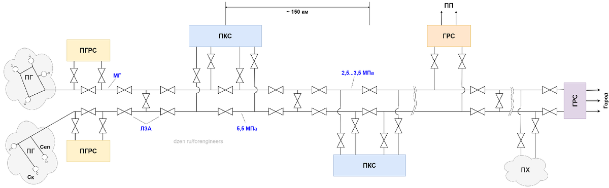 Схема, которая приведена выше - это “классика жанра” из советских учебников. В более новых системах давление может быть более 5,5 МПа, например, 7,5 и выше. Повышение давления позволяет увеличить пропускную способность газопроводов, но и требует более совершенных материалов и компрессорных станций.