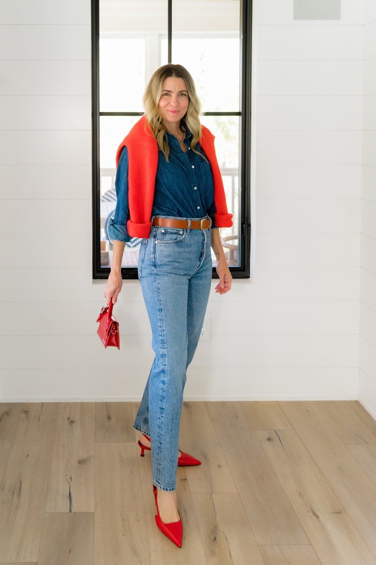 Красные акценты в виде фактурного шерстяного свитера, изящных туфель-лодочек на небольшом каблуке, а так же крохотная сумочка делают кэжуал образ элегантным и шикарным. То что надо для городского повседневного шика.