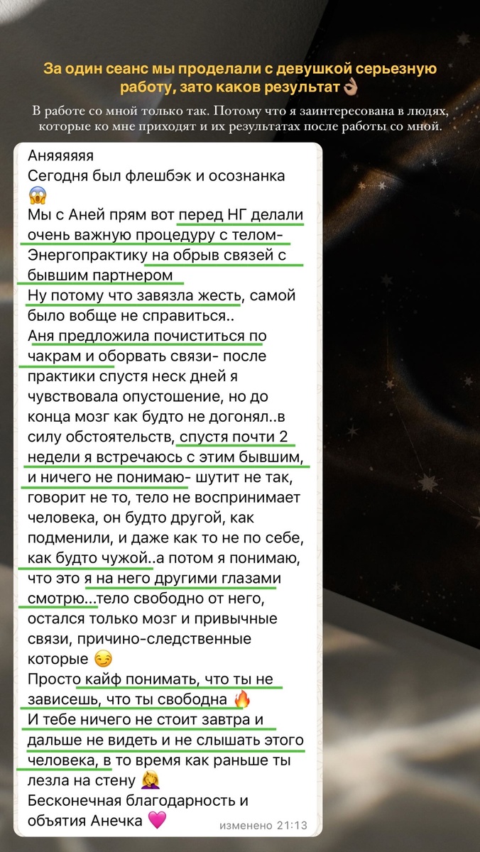 В сегодняшней статье я хочу поделиться со своими читателями обратной связью от одной из своих доверительниц. Она не понаслышке знает, что это такое. Также я хочу дать общую информацию о деструктивных энергетических привязках. Ниже в данной статье вы сможете ознакомиться с обратной связью, которую оставила моя доверительница. Она очень подробно описана свои ощущения и перемены в жизни, которые произошли с ней, после того, как мы убрали деструктивную энергетическую связь с её бывшим возлюбленным. Одним из главных признаков, деструктивной энергетической привязки - будут навязчивые мысли об определенном человеке. На уровне мозга, вам может казаться, что вам всё равно, безразлично. Однако вы снова и снова прокручиваете в своей памяти моменты вашей с ним ссоры, вспоминаете слова, произнесенные человеком ранившие вас, или же наоборот ностальгирует по тому времени, когда вы были счастливы вместе, вспоминаете ваши общие мечты и цели, которым уже, не суждено сбыться. Знакомо? Лично мне о