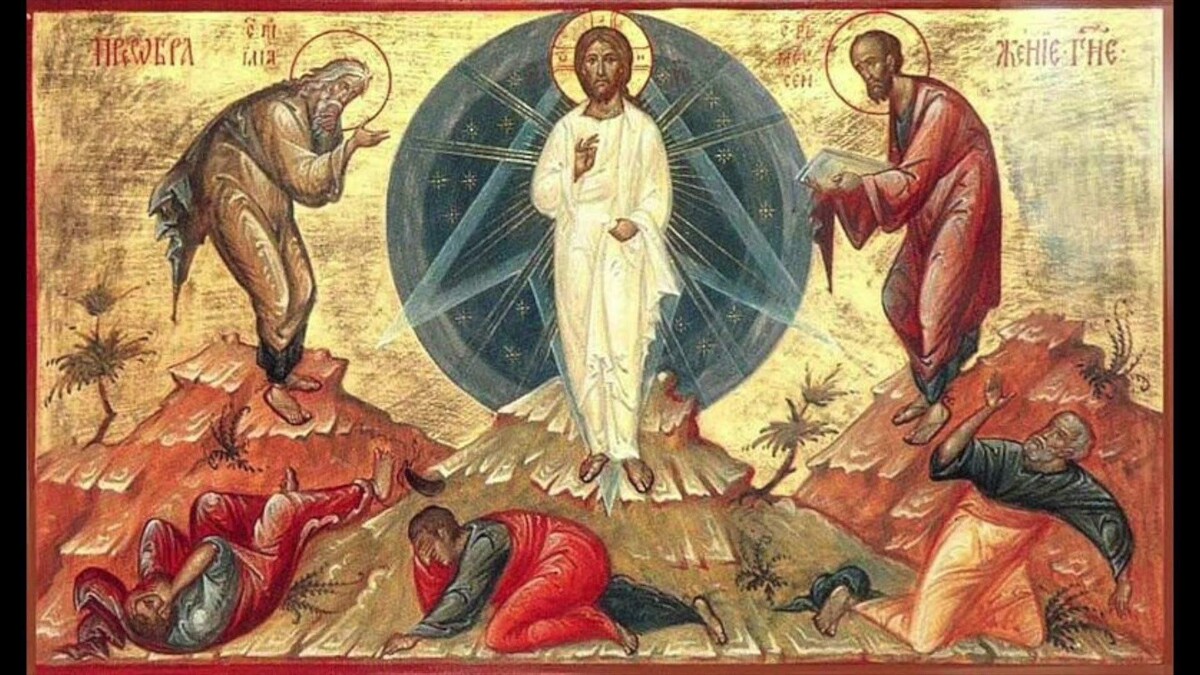 "Через шесть дней Иисус взял Петра, Иакова и брата его Иоанна и повел их одних на высокую гору. Там весь облик Его изменился у них на глазах: от лица Его исходило сияние, словно от солнца, а одежды Его белизной лучились, как свет. И явились им Моисей и Илия, они беседовали с Иисусом.