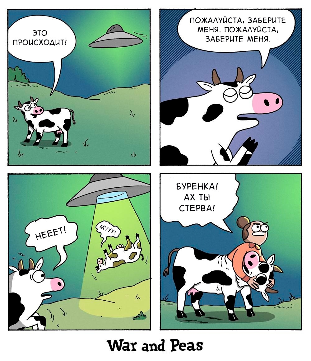 Череда подборок про всякую нечисть, мифических существ и прочие схожие темы продолжается - не так давно в этом блоге выходили материалы про вампиров и призраков (ссылки можно найти в конце статьи), ну а сейчас настало время инопланетян. В общем, сегодня вас ждут забавные сюжеты про летающие тарелки, похищения и гостей с других планет. Надеюсь, что вам понравится! В серии комиксов War and Peas (англ. «Война и Горох», созвучно с «War and Peace» - «Война и мир») от немецких художников Элизабет Пич (Elizabeth Pich) и Джонатана Кунц (Jonathan Kunz) есть несколько персонажей, которые появляются в выпусках регулярно. Среди них дерзкая ведьма, грустный робот, а с недавних пор еще и женщина-ученый, которая одержима инопланетянами. Ниже - один из выпусков про нее. Английский художник Крис Маккой (Chris McCoy) - автор серии комиксов Safely Endangered («Под угрозой исчезновения») - рисует простенькие комиксы на самые разные темы: главными героями могут становиться как обычные люди, так и ожившие п