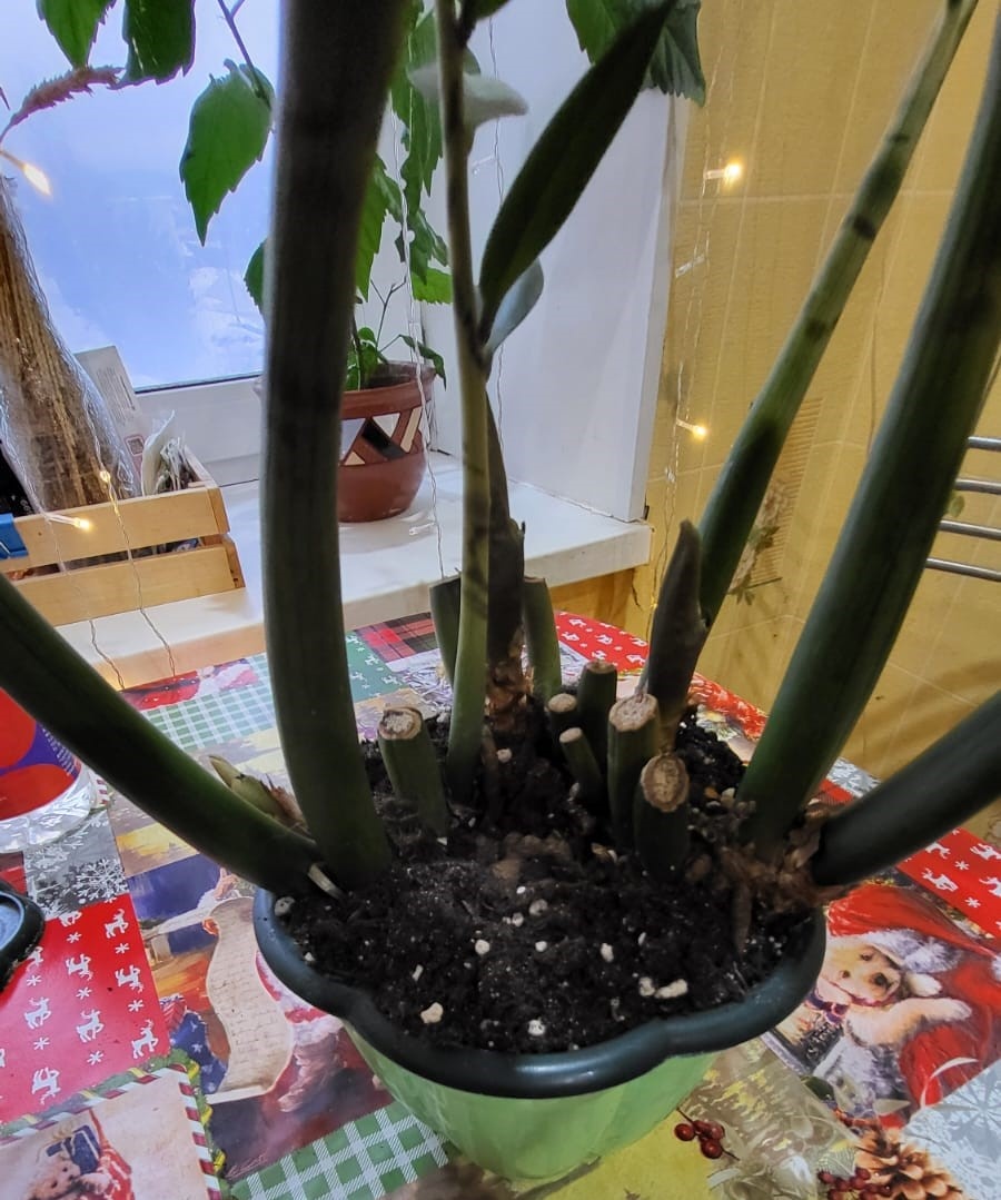 Здравствуйте, дорогие мои подписчики и гости моего канала. Предыстория: девочка попросила помочь пересадить замик, так как он совсем стал “вылезать” из горшка. Вчера я взяла субстрат для суккулентов, керамзит и отправилась к знакомой. Цветок несколько лет не пересаживался, грунт не обновлялся. Горшок маленький и он давно просит пересадить его в горшок объемом побольше. Когда мы его вытащили из горшка, просто удивились как столько корней могло поместиться в старом горшке. Практически весь грунт был съеден. Листья были в пыли. Я вот сегодня думаю, может клещ? Вот сейчас смотрю на фотографию и больше убеждаюсь. Но растение никогда не мыли и не обтирали листики. В любом случае, если клещ, то проявится. Будем ждать, если что, то будем лечить. Листья протерли, когда пересадили, будем наблюдать: как будет себя вести растение. Большего горшка не нашли. Решили посадить в два горшка, но и в два он не вошел, достали еще один горшок. Я совсем забыла взять с собой уголь, просто не подумала, что пр