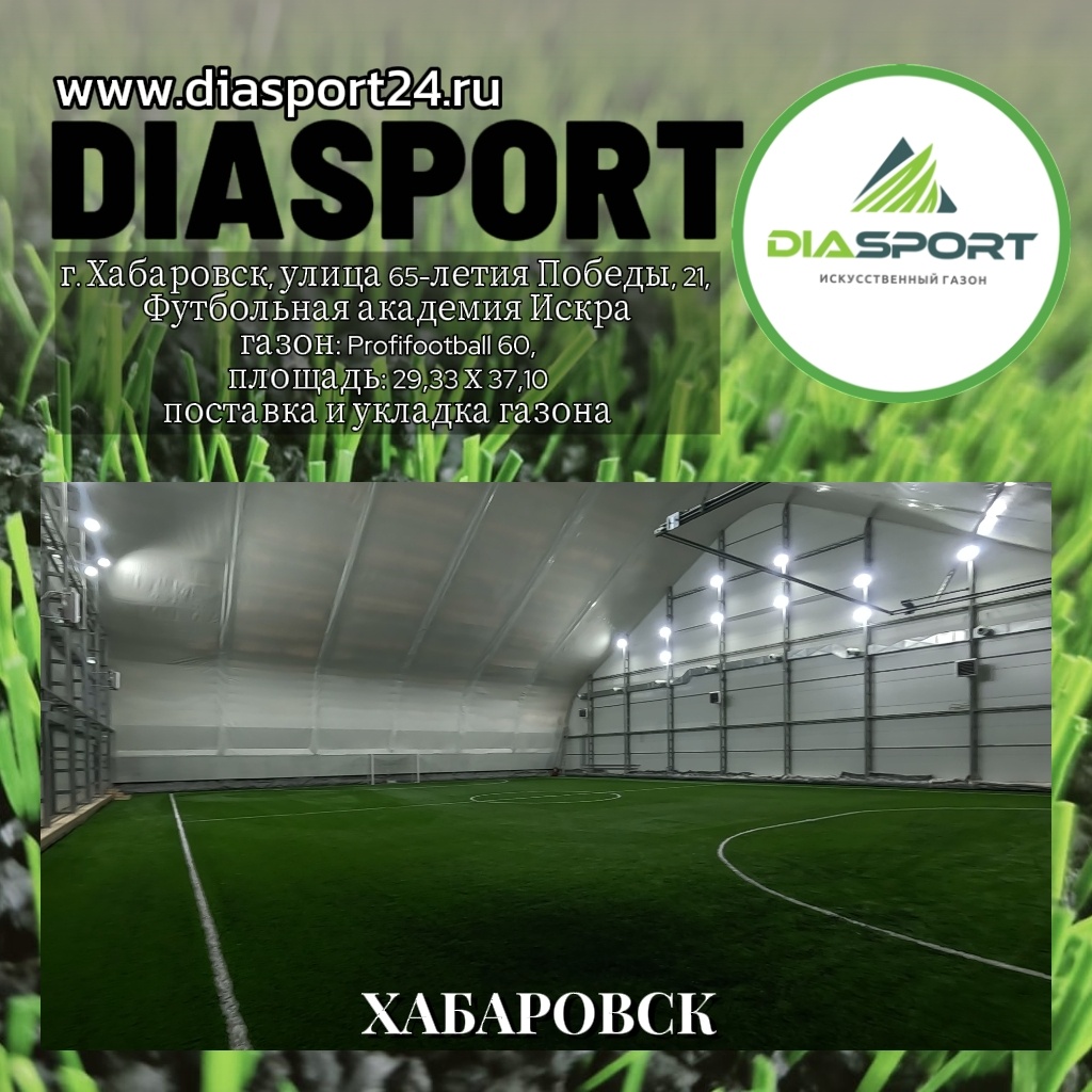 Конечно, вот вариант описания для Инстаграм: Мы рады сообщить о завершении еще одного успешного проекта! Компания DiaSport осуществила поставку и укладку газона для Футбольной академии "Искра" в Хабаровске по адресу ул. 65-летия Победы, 21. Для этого проекта был использован высококачественный газон Profifootball 60, который идеально подходит для профессиональных футбольных полей. Площадь уложенного газона составила 29,33 х 37,10 метров, что обеспечит комфортные условия для тренировок и игр юных футболистов. Мы гордимся своим вкладом в развитие спортивной инфраструктуры города и уверены, что новое футбольное поле станет отличным местом для достижения спортивных успехов! #DiaSport #ДиаСпорт #укладкагазона #футбольноеполе #Хабаровск #футбольнаяакадемияИскра #Profifootball60 #профессиональныйгазон #спорт #спортивнаяинфраструктура #строительствостадионов #искусственныйгазон #газонподключ #футбол #детскийфутбол #спортивныйпроект #Khabarovsk #footballfield #grassinstallation #artificial