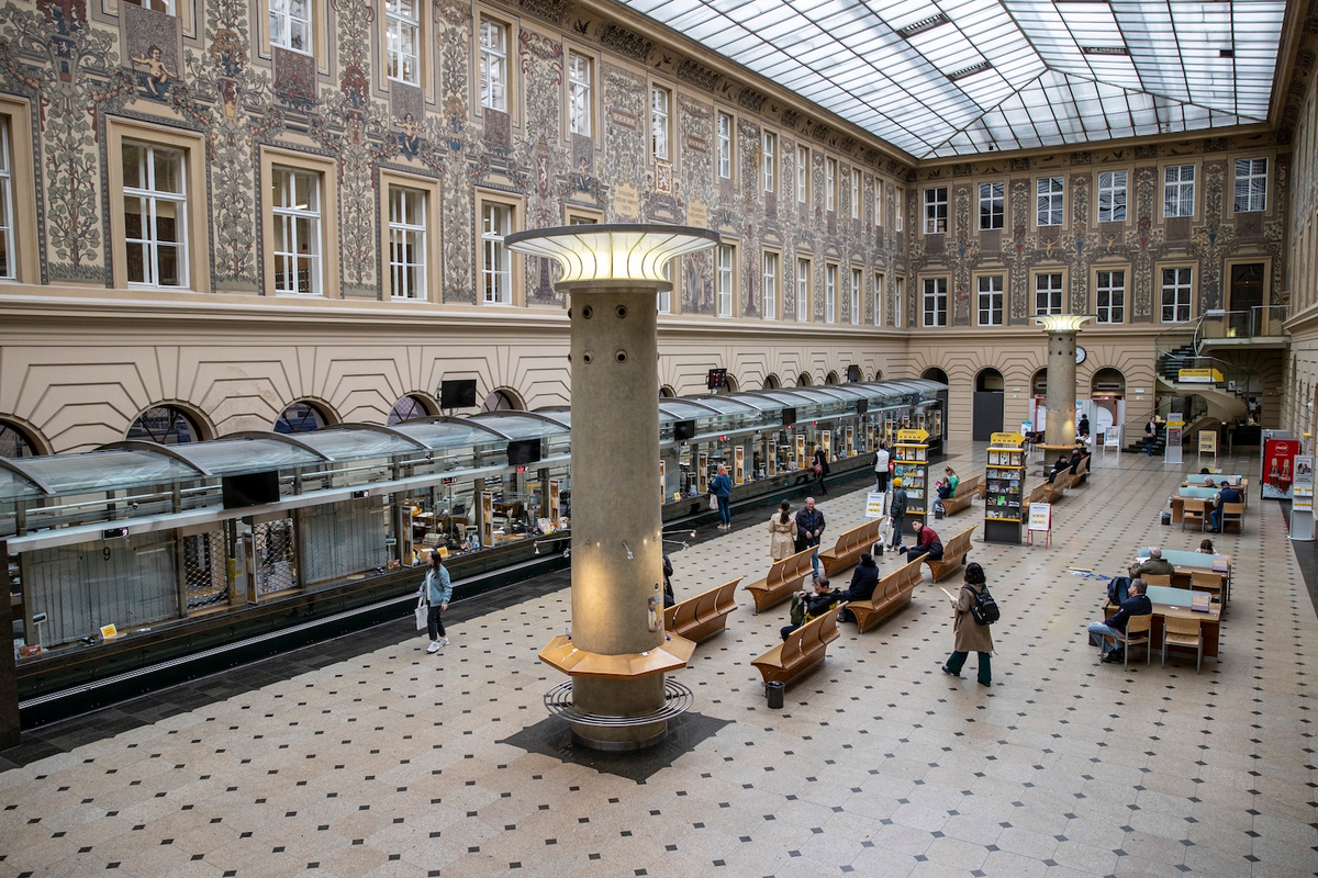 «Неоренессансное здание сохранилось в основном в своем аутентичном виде - таким, каким оно было построено для целей почты в 1870-х годах по планам Антона Брандтнера, особенно его прекрасный интерьер, в котором доминирует монументальный внутренний зал с росписями Карела Витезслава Машека в стиле неоренессанс», - описывает Андреа Холашова из Института национального наследия.