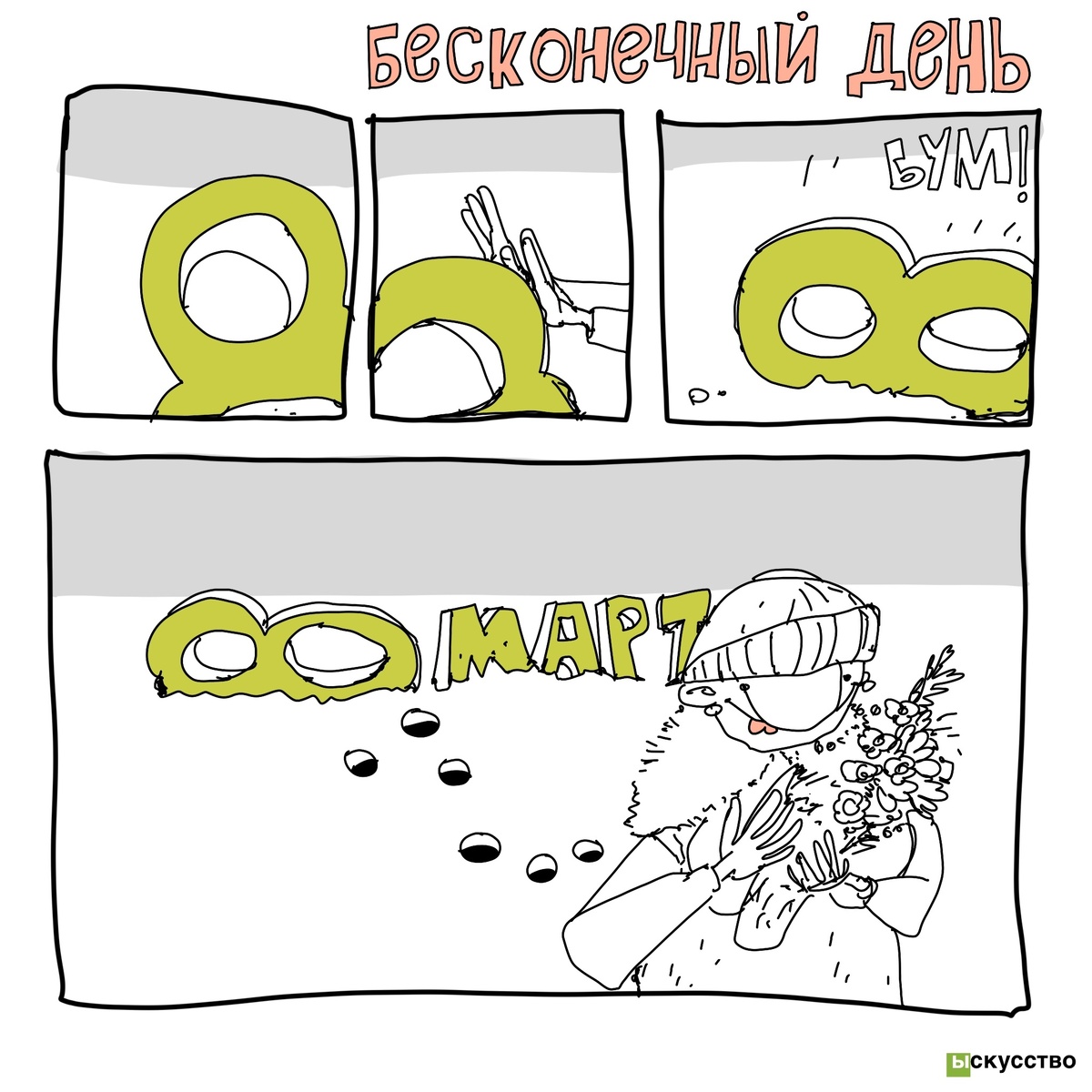 По уже сложившейся за годы ведения этого блога традиции к большинству известных и популярных праздников здесь выходят специальные тематические подборки. И к Международному женскому дня я всегда тоже стабильно что-нибудь готовлю хотя бы просто потому, что всегда находятся новые комикс на эту тему. В общем, сегодня я собрал для вас еще несколько забавных комиксов про 8 марта, подарки, цветы и поздравления. Надеюсь, что вам понравится! И, конечно же, всех дам с праздником! Российский художник Павел Родионов - создатель проекта с лаконичным названием ыскусство - в честь 8 марта нарисовал забавный комикс о том, каким способом Международный женский день можно было бы сильно продлить. На канале КОМИКСЫ И ЮМОР! тоже выходил небольшой комикс, приуроченный к женскому празднику. Всем, кому кажется, что время с каждым годом летит все быстрее и быстрее - посвящается. В прошлом году я тоже рисовал комикс на тему 8 марта - он выходил в моей группе Мозги трески и был нарисован в коллаборации с интерне