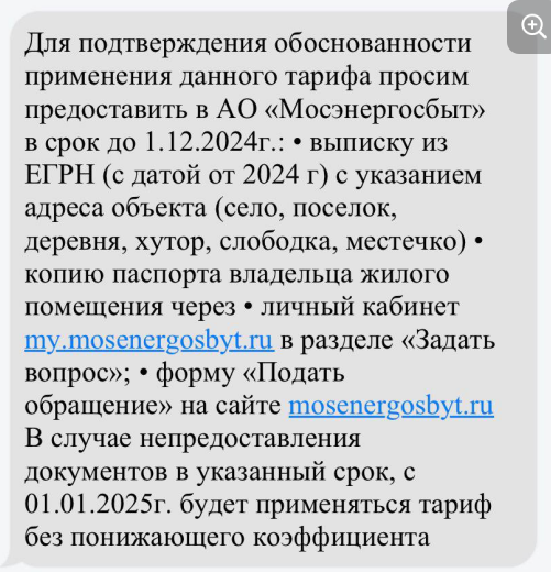 Подписчик канала прислал прелюбопытнейший документ от Мосэнергосбыта. Хочу обратить внимание всех, у кого до 31.12.2024 г. был сельский тариф на ЭЭ: До 01.12.2024 г. нужно было предоставить в Мосэнергосбыт свежую (не старше 60 дней до дня подачи) выписку из ЕГРН, дабы подтвердить правомерность применения сельского тарифа. Тем, кто такую выписку до 01.12.2024 г. не предоставил или предоставил ее позже указанного срока, с 01.01.2025 г. были автоматически изменены тарифы на городские. Чтоб вернуть сельский тариф и получить перерасчет за январь, необходимо в личном кабинете создать обращение и приложить свежую выписку из ЕГРН, в которой адресный ориентир объекта должен включать конкретный населенный пункт: деревню, село и т.п.