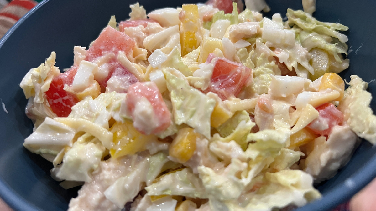 Ингредиенты: яйца отварные - 2 шт куриная грудка отварная - 1 шт сыр натертый - 150 г помидор - 1 шт перец болгарский - 1 шт кукуруза консервированная - 3 ст.ложки пекинская капуста или листья салата Для заправки: греческий йогурт, горчица, соль, перец. Приготовление: Яйца и курицу отварить до готовности, порезать кубиками. Сыр натираем на крупной терке, помидор и перец нарезаем произвольно, у меня тоже кубиками. Нарезаем(или рвем) капусту и добавляем в салат. Заправляем греческим йогуртом (1 столовая ложка) и горчицей (1 чайная ложка). Если хотите поострее - можно побольше горчички добавить. Солим и перчим по вкусу. Все перемешиваем и лопаем. Приятного аппетита 🤗❤️