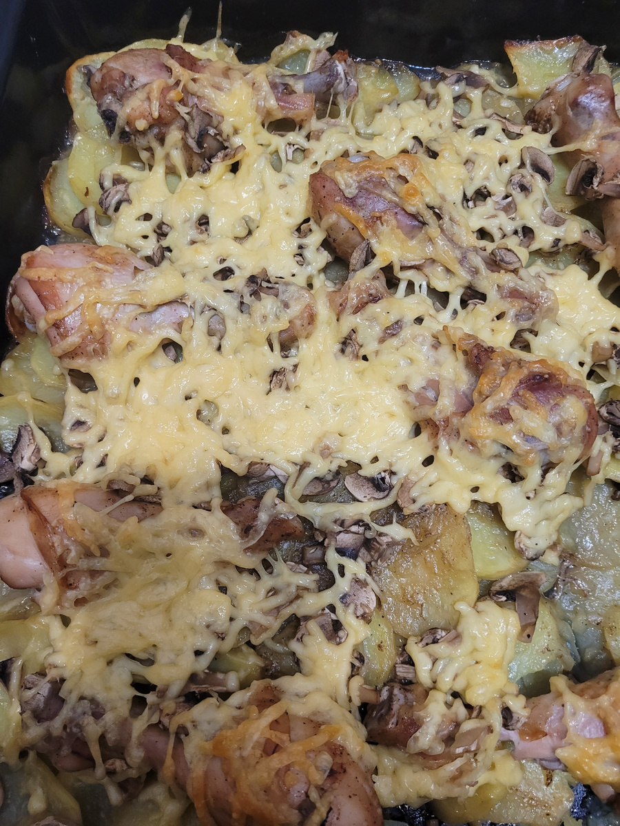 Понедельник...надо на работу топать, а как не хочется. Продолжение конца месяца, хорошо что последний день. А то у нас, как у Мюнхаузена ... Ну это ладно, отработали. Совещания все посетили, люлей получили. Живём дальше. На работе дочь спрашивает о том, что я сегодня буду готовить. А я не знаю, чего-то вкусного хочется. Она предлагает, а не пожарить ли...и на этой фразе я её обрываю, а на чем??? Она забыла...Ну ладно тогда говорит, сделай в духовке картошечку с курочкой, когда приготовится, то сверху грибочков положи шампиньонов, а потом сыром посыпь. Заехали купили голени куриные, шампиньоны и сыр. Муж ещё по мелочи набрал чего захотел. Приехали, муж с Тиной гулять отправился, а я бегом к плите, как говорится, надежда умирает последней. Нет газа. Эх. Ну что сделать, я уже почти свыклась с этим. Это первые дни тяжковато, а потом ничего, привыкаешь. Но когда приедешь домой, кушать сразу хочется. Думала, придумала - налью воду в сковороду, как нагреется положу манты, мант