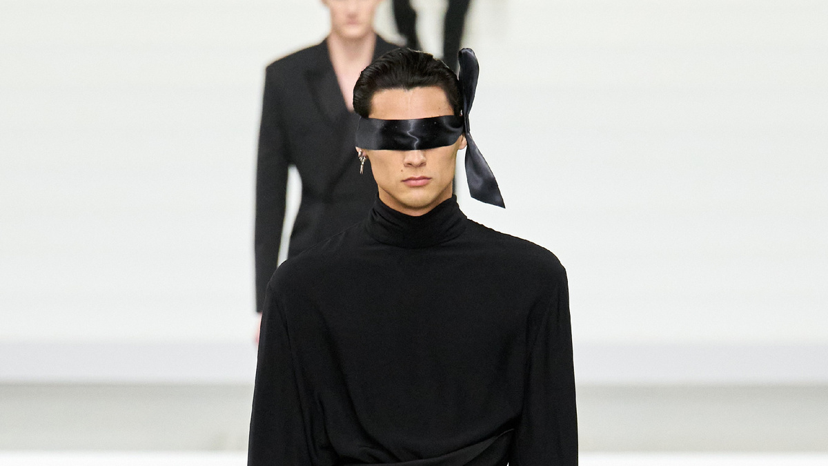 Первая модель и открывающий образ - своего рода спойлер и концепция всей коллекции. На первый взгляд это был монохромный черный лук, повязка на глаза, черный свитер - верх, черные оверсайз брюки - низ. Но мы же говорили о деталях, и первый образ - отличный пример их важности. Ведь то были не брюки и не юбка, как многие могли подумать. Это было черное пальто, надетое задом-наперед с воротником, образующим своего рода асимметричный пояс. А это, напомним, только первый образ…
