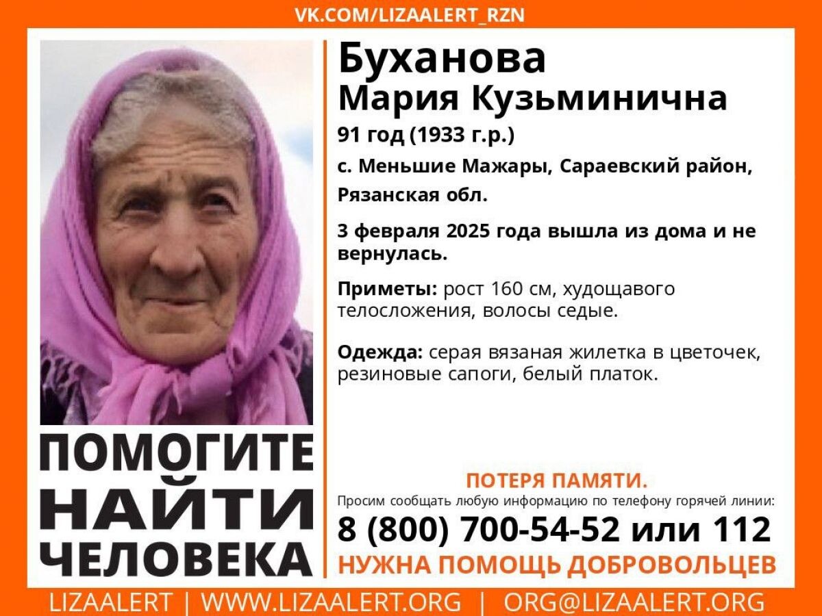 Волонтеры Рязанской области начали поиски пропавшей в селе Меньшие Мажары Сараевского района 91-летней Марии Бухановой. Об этом сообщается в группе ПСО "ЛизаАлерт по Рязанской области". Пенсионерка вышла из дома 3 февраля и не вернулась. Женщина ростом 160 сантиметров, худощавого телосложения. У нее седые волосы. Она была одета в серую вязанную жилетку в цветочек, резиновые сапоги и белый платок. Отмечается, что у пенсионерки может быть потеря памяти. Для поисков требуются волонтеры. Штаб начинает работу 3 февраля 2025 года в 20:00. Адрес штаба: село Меньшие Можары, улица Советская, дома 74. Форма одежды: зимний лес. Всех, кто располагает информацией о женщине, просят сообщить по телефону: 8 (800) 700-54-52 или 112.