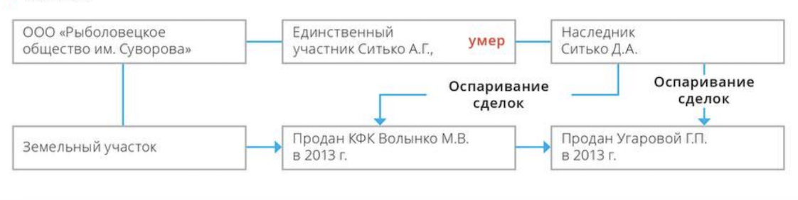 Единственный участник ООО «Рыболовецкое общество им. Суворова» А.Г. Ситько умер 20.12.2020. Его сын Д.А. Ситько оказался единственным наследником. После вступления в наследство он узнал, что согласно договору от 1 августа 2013 г. обществом «Рыболовецкое общество им. Суворова» был продан земельный участок КФХ Волынко М.В. Согласно договору от 2 августа 2016 г. участок был перепродан Угаровой Г.П. Считая отчуждение незаконным, поскольку фактически владелец не сменился, Д.А. Ситько обратился в суд с целью признать недействительными эти сделки (см. схему на фото).