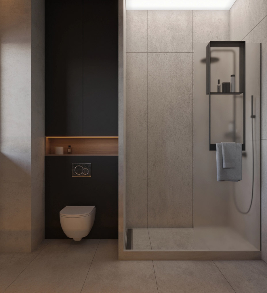 Стильная душевая комната для двоих в интерьере частного дома. Интерьер душевой выполнен с большим вниманием к деталям и современным трендам. Душевая выполнена из светлого керамогранита цвета песка создает ощущение легкости и свежести, напоминая о пляже и гармонично сочетается с матовой стеклянной перегородкой. Такая перегородка не только функциональна, но и придает душевой современный и стильный вид. Инсталляция для унитаза скрыта в чёрном шкафу с открытой полкой, что позволяет экономить пространство и поддерживать порядок. Светодиодная подсветка добавляет нотку современности и подчеркивает элегантность дизайна. Тёмная мозаичная стена, которая придает пространству элегантность зоне умывания. Большая подвесная столешница с раковиной, рассчитанной на двоих, что особенно удобно для семейных ванных комнат. Два больших овальных зеркала не только функциональны, но и визуально расширяют пространство, отражая свет и создавая ощущение простора. Потолочная подсветка по периметру обеспечивает рав