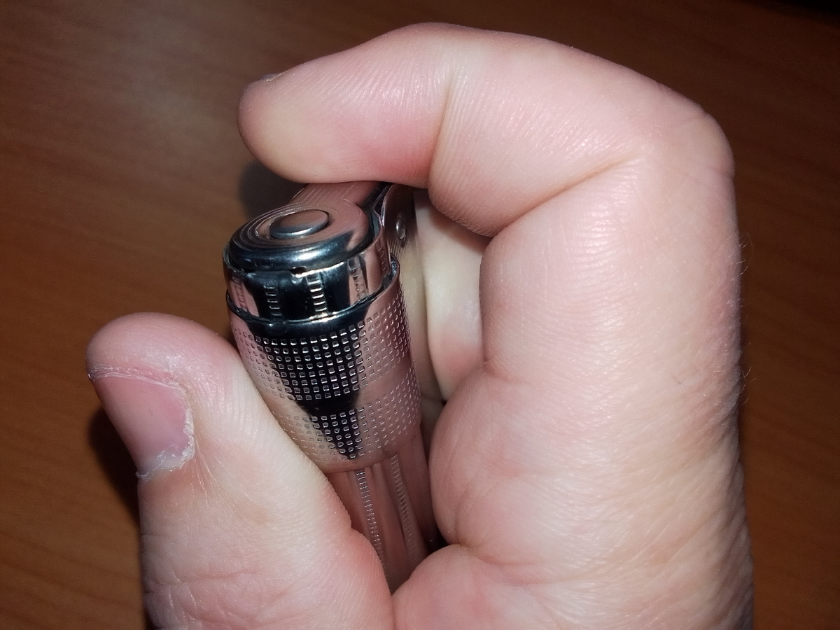 Попытки щелкать крышку-кнопку большим пальцем показались неудобными, зажигалка при этом хвате плохо лежит в руке.