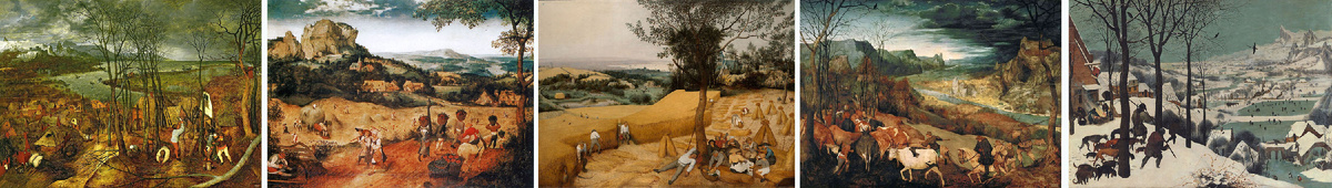Вот я и добралась в пятой картины из "Времен года" Брейгеля: "Жатва" — предположительно, август-сентябрь. Прекрасная Фландрия.... Написана картина была в 1565 году по заказу купца из Антверпена Николаса Йонгелинка. У купца пробыла недолго, а потом у нее сменилось множество владельцев, а в 1919 году была приобретена музеем Метрополитен в Нью-Йорке. Да, Европа лишилась этой удивительной картины. Казалось бы, "Жатва" — это именно то, что в названии, но все же гораздо больше. Это у других художников в часословах и календарях все довольно просто — вот как на этой миниатюре XIII века. Или как на миниатюре XV века из "Прекрасного часослова герцога Беррийского" братьев Лимбург. Мгновение летней жизни — жатва и стрижка овец. Брейгель же показывает целый мир. Здесь есть все — суша и море, мир сельский, мир церковный и мир дворянский (видите там вдали слева замок?). И при этом здесь действительно царит мир. Здесь нет вооруженных людей. Здесь нигде незаметно традиционных виселиц и колес. Люди