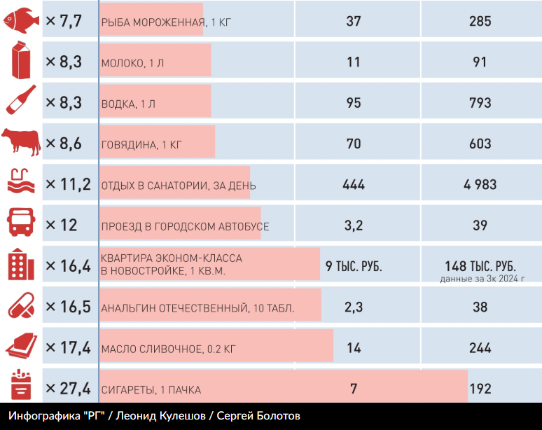 Хуже всего в 21 веке живется курильщикам. С опорой на статистику Росстата названы 10 самых подорожавших популярных товаров с 2001 года, то есть, с начала текущего века. За неполных 25 лет страшнее всего подорожали сигареты* – в 27 раз. В 2001 году одна пачка продавалась в среднем за 7 рублей, сейчас – за 192 рубля. На втором месте – сливочное масло, подорожавшее в 17,4 раза (с 14 рублей до 244 рублей за 200 граммов). Замыкает тройку отечественный Анальгин. Он вырос в цене в 16,5 раз (с 2,3 рублей до 38 рублей за пачку). Недалеко ушли и квартиры. Один квадратный метр в новостройке эконом-класса в 2001 году стоил 9 тысяч рублей, а в конце 2024 года – 148 тысяч рублей. Рост – в 16,4 раза. На пятом месте – проезд в городском автобусе, подорожавший с 3 рублей 20 копеек до 39 рублей в среднем по стране (или в 12 раз). А вот так выглядит весь топ-10 в инфографике «Российской газеты»: Три товара, по которым инфляция ударила гораздо меньше – замороженная курица, подсолнечное масло и свинина. Эт