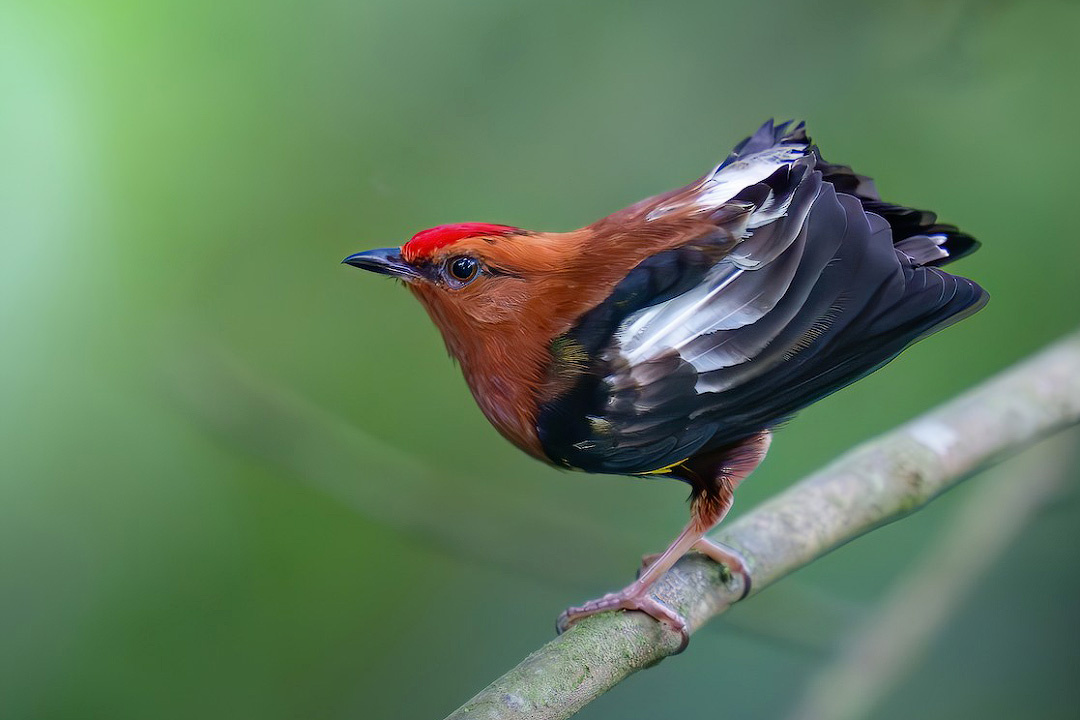 Знакомьтесь – красношапочный корольковый манакин (Machaeropterus deliciosus), обитатель тропических лесов Эквадора и Колумбии. Самцы имеют яркую привлекательную окраску; самочки, как это часто водится у птиц, окрашены скромно, дабы не привлекать внимание хищников во время насиживания и выкармливания птенцов.