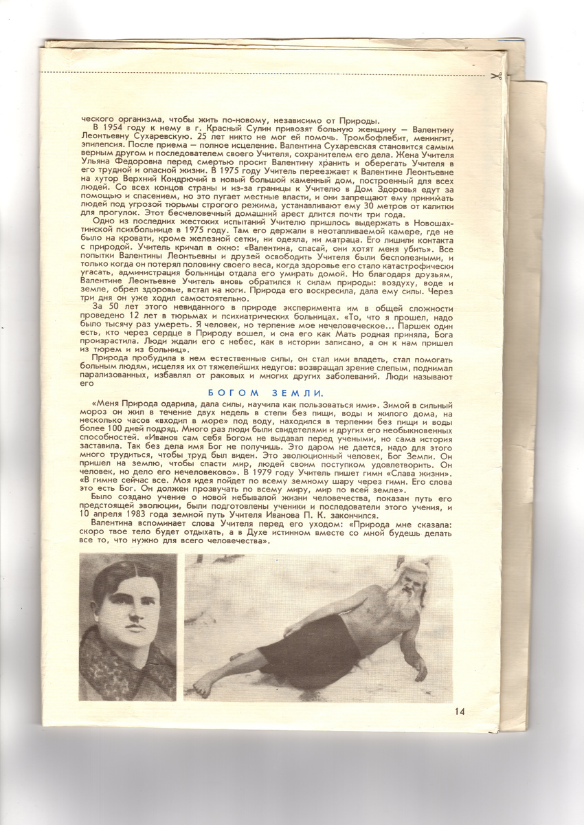 Так нет, уважаемые, это мировое значение. Нам на- до любить Природу как мать свою через правду свою, свои слова говорить. Это не болезнь играет роль над человеком, а играет человек роль над бо- лезнью. Нам надо учиться у Иванова, чтобы не по- падать в тюрьму и не ложиться в больницу, а быть свободным всегда, не лезть на рожно. Свою веж- ливость представить: низко поклониться старику, старушечке, дяде с тетею, да молодому человеку. Эх, и жизнь Моя тяжелая для всех! Сердце свое закалите, милые Мои люди, вы гляньте на солнышко, вы увидите правду, свое выздоровление быть таким как Я: Победитель Природы и Учитель на- рода.