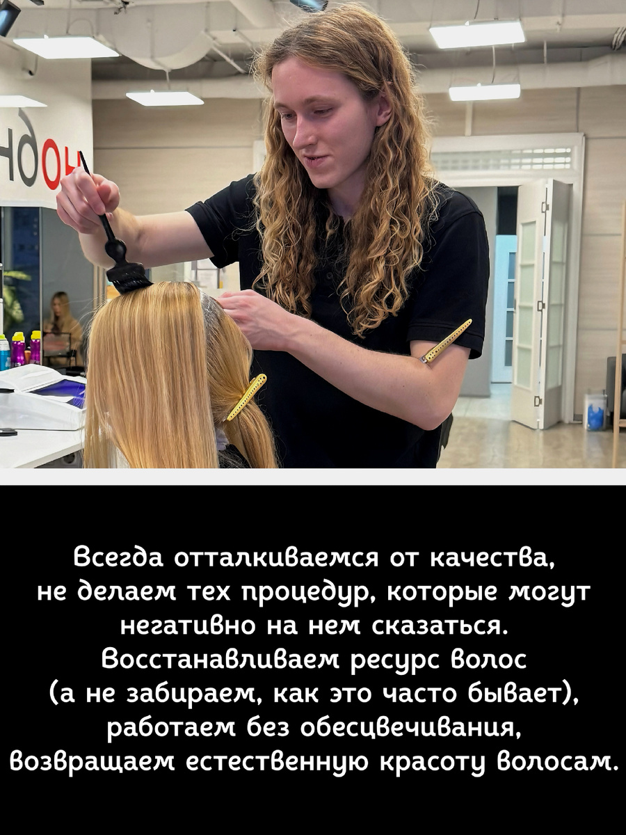 •Всегда отталкиваемся от качества, не делаем тех процедур, которые могут негативно на нем сказаться. Восстанавливаем ресурс волос (а не забираем, как в других салонах), работаем без обесцвечивания, возвращаем естественную красоту волосам.