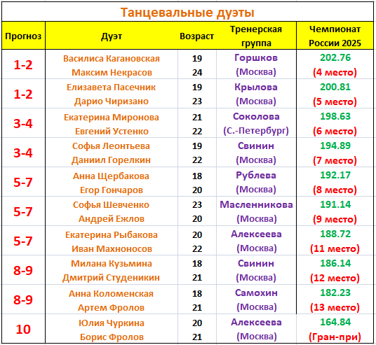 Кроме трех лучших наших дуэтов финал Гран-при также пропускают участники недавнего Чемпионата России Лиза Шичина/Павел Дрозд, Софья Тютюнина/Матвей Грачев, Дарья Савкина/Александр Вахнов, а также Варя Жданова/Тимур Бабаев-Смирнов. Причина пропуска во всех случаях - проблемы со здоровьем у одного из партнеров. Такие массовые снятия позволили стать участниками финала далеким запасным Юлии Чуркиной/Борису Фролову, лучший результат в сезоне которых намного уступает всем остальным парам. С последним местом все понятно, а вот дальше будет борьба и определенная непредсказуемость.
