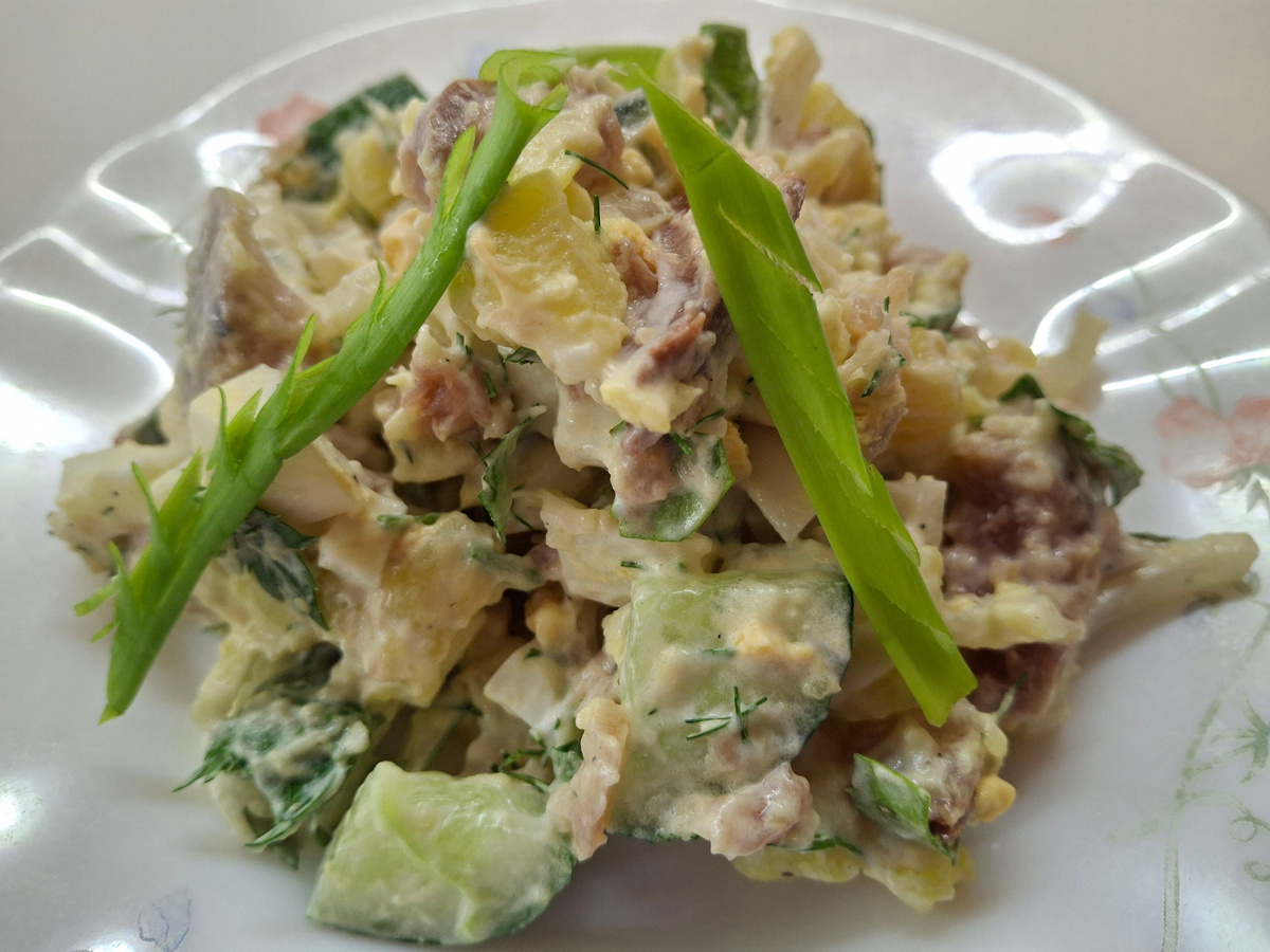 Также в ней много йода, кальция, фосфора, калия, цинка, магния, железа и натрия. Состав: Приготовление: Отварите картофель и яйца в крутую, остудите, почистите. Огурец, картофель и яйца режем крупным кубиком, складываем в салатник. Лук и зелень режем мелко, добавляем в салатник. Скумбрию чистим, удаляем кожу и все косточки. Режем её или ломаем на куски и в салатник. Добавляем в салатник майонез, перец (соль по вкусу, я не добавляла). Перемешиваем. Готово. Украшаем зеленью. Приятного аппетита!!!