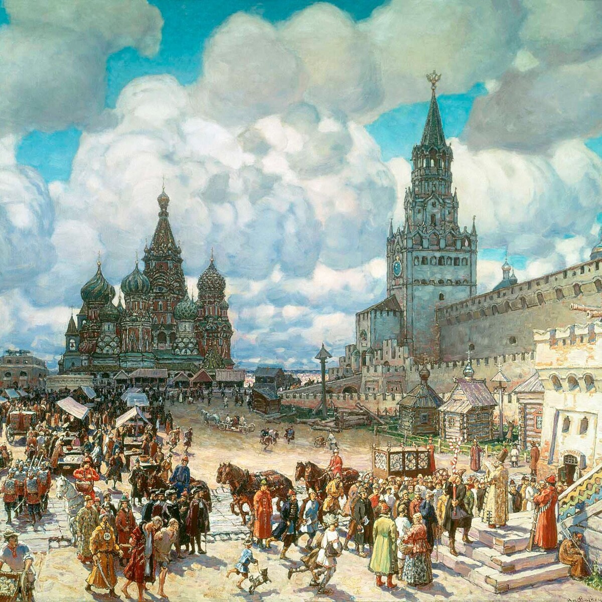 и выглядит она уж очень правильно, что для средневекового города весьма странно. Государь Иван III, рубивший окно в Европу намного раньше Петра, в конце XV века пригласил на Русь итальянцев, которые построили Кремлёвские стены, что мы видим во всей красе до сих пор. Помимо красоты надо было заботиться об обороне: враг может пойти штурмом. Чтобы не допустить врага до стен, пользовались пищалями – первыми ружьями. Стреляли они не дальше 230 м. В итоге для эффективной обороны Иван повелел освободить пространство вдоль новёхоньких стен от всех построек и запретил там что-либо строить ближе 109 саженей. Такая реновация вызвала негодование москвичей, но против государя не пойдёшь. Потом, конечно, площадь опять заставили лавками, с которыми боролись следующие государи или просто всё сгорало при очередном пожаре. Недаром, площадь называли и Торгом, и Пожаром. Сейчас Красная площадь в ширину чуть более 100 м, и можно усомниться в этой истории, но есть доказательства: с западной стороны Крем