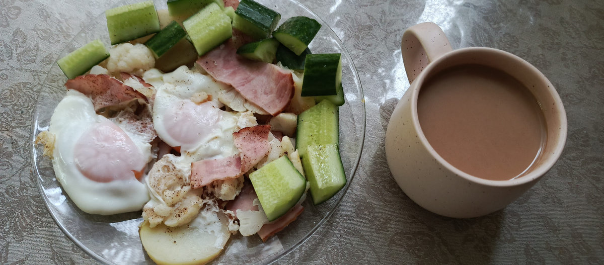 Завтрак яичница с ветчиной, цветной капустой и одной картофелиной, огурец, кофе с молоком 1,5%