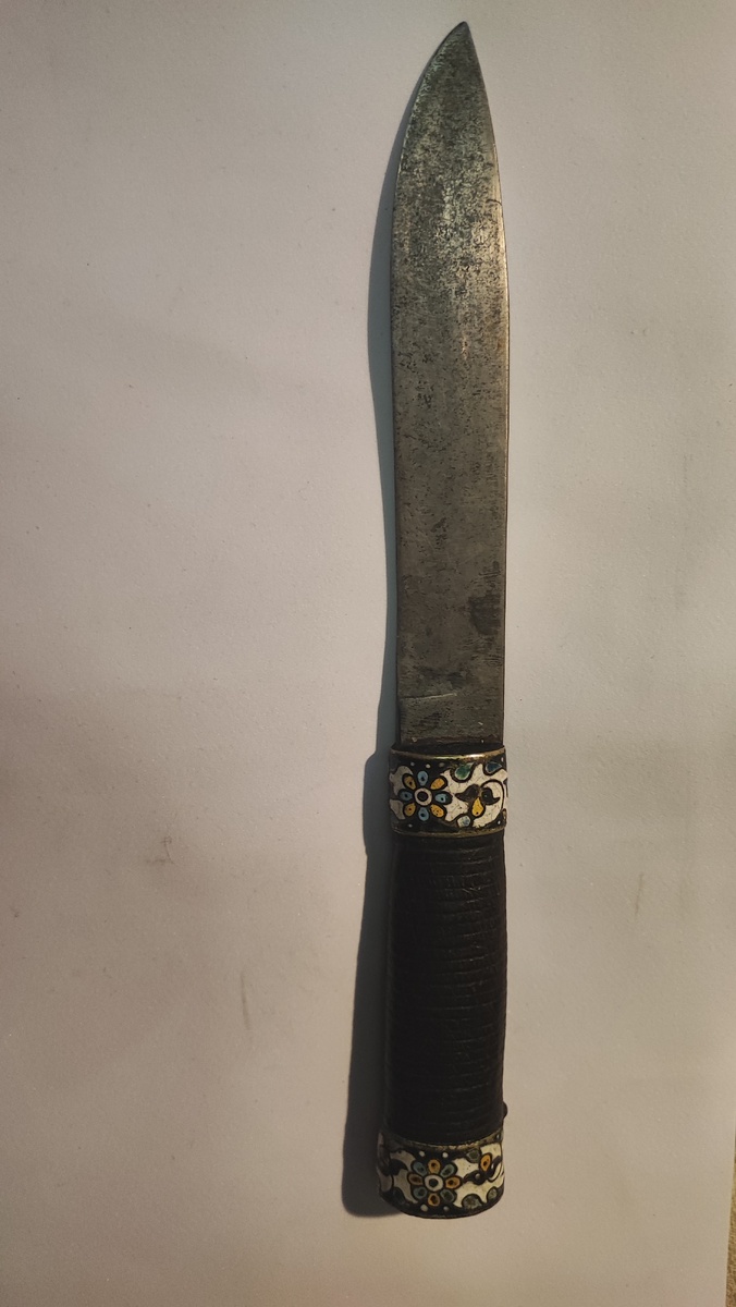 Предмет после реставрации. К обоймице и тыльнику 17-18 вв добавлен вместо сгнившего - клинок конца19 в. и свременный материал для рукоятки ( вт.ч. кожа, состаренная). Клинок примерно 3 мм, но - лопнул. :0) Старость не радость... И это не обман зрения... Она пересекает обух :0(( Клинок так крепится: его хвостовик изогнуи и выглядывает у тыльника... :0) Но сохран латунных частей с эмалью - хороший. Да? пс Дорогой... Просили 18 тр... :0( Пасхальнпя подвеска - 1900 гг