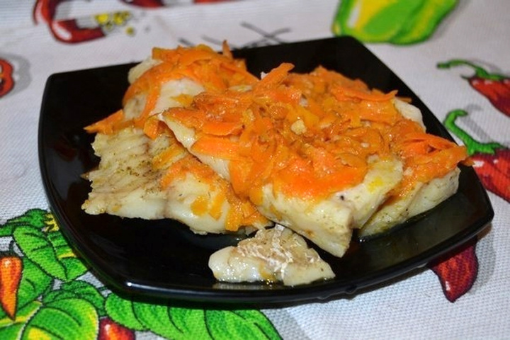 Ингредиенты на 2 порции: ✔ Филе рыбы (подойдет любая нежирная, даже сухой минтай годится) - 300 г; ✔ Морковь - 2 средние; ✔ Чеснок - 1-2 зубчика, растительное масло для жарки - 1 ст. л. Приготовление: рыбу нарезаем кусочками, присаливаем, немного перчим, оставляем минут на 10. Морковь натираем на крупной терке, чеснок давим прессом, все обжариваем на растительном масле. Выкладываем обжарку в другую посуду, а в сковороду, где жарили морковь с чесноком, выкладываем рыбу (лучше в один слой, чтобы кусочки плотно располагались друг к другу). Поверх рыбы выкладываем овощи, вливаем в сковороду немного воды и ставим тушить на слабом огне в течение 20 минут. Можно приготовить для такой рыбы гарнир, а можно подавать только рыбу. КБЖУ на 100 г - 85/7,9/4,3/4,0. Рецепт на странице Автор рецепта – Вероника Чиркова Расчёт КБЖУ сделан с помощью Telegram-чат-бота https://t.me/vesipitaniebot © Почтенный возраст Online и Рецепты для диабетиков