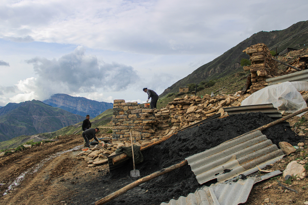 За поворотом дороги показался фундамент каменного здания, у которого работали трое мужчин. — Салам алейкум! – как обычно поздоровались мы. Рамазан посоветовал говорить именно так, а не «здрасьте», как мы приветствовали всех до Изано. — Аллейкум ассалам! – мужчины лет пятидесяти оживились и сразу предложили нам чай. Отказывать было неудобно, хоть мы и спешили. Но разве не за этим мы шли сюда? Нас разместили на бетонной площадке в центре постройки, там же был маленький столик и бревно вместо лавочки. Один мужчина остался наливать нам чай, а другие продолжили выкладывать стены молельного дома из камня. Умелыми руками мастера подгоняли каждый кусочек, откалывали лишнее, если это было необходимо. Все камни были разного размера. Нам объяснили, что молельные дома строят у родников, чтобы совершать омовение перед молитвой. Женщины – отдельно от мужчин. Молельные дома нужны, чтобы молиться в пути из одного села в другое. Также можно делать это дома или в мечети. Когда мы ехали из Агвали в М