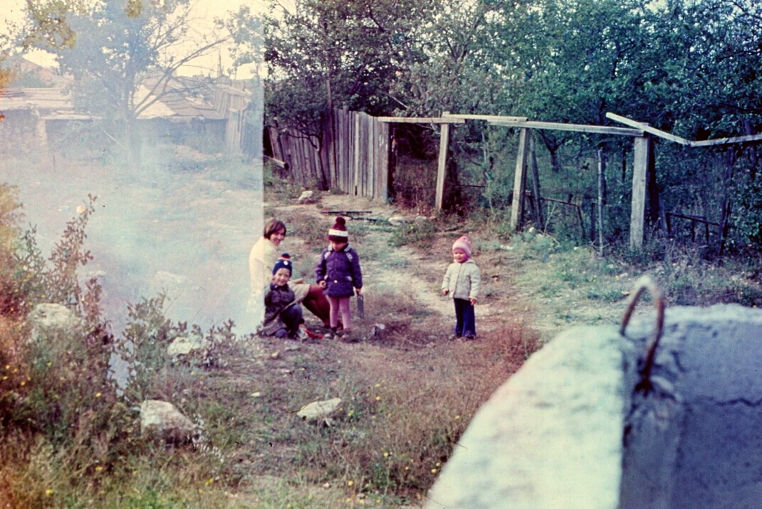 Летом за каждым забором стояли кровати под навесами, где спали приезжающие отдыхающие, море рядом, будущий пляж парка Победы. Мы жили с видом на этот пустырь, папа увидел, что эта картина из жизни достойна того, чтобы её запечатлеть. Мы с мамой, дачки и соседская девочка, радостно папе что-то показывающая. О других подробностях - под вчерашней фотографией.