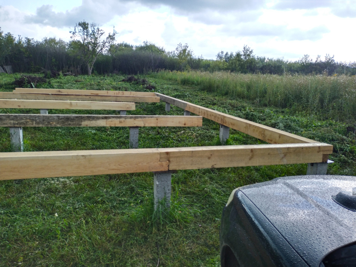 Обвязку дома решено было делать из бруса, главным критерием этого выбора была простота и быстрота ее изготовления. Материал стен дома будет из профилированного бруса 150*200 (где 150мм это ширина, а 200мм высота), брус для обвязки был выбран аналогичный. Материал обвязки как и стен - сосна. Изначально расскладываем брусья на сваи и запиливаем углы соединения в пол бруса. Так чтобы соединение лежало четко на свае. После того как собрали "коробку" чётко выставляем диагонали, проверяем уровень всех свай где необходимо сделать выборку или "подложку". Далее приступаем к обвязке середины дома, дабы задействовать несущую способность всех свай, сделать фундамент монолитным. После полной подгонки всей обвязки, контрольно проверяем диагонали. Следующий этап это обработка бруса биозащитной пропиткой, отделяем по бревну и проходим валиком, втирая состав в волокна древесины, места соединения проходил кисточкой. На оголовки свай нанес битумную мастику, и проложил один слой рубиройда, дабы исключи