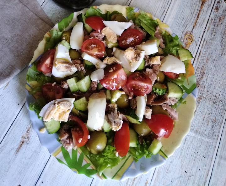 ✔ Листья салата Айсберг - 3-4 шт.; ✔ Тунец в собственном соку - 100 г; ✔ Помидоры черри - 8-10 штук; ✔ Свежий огурец ~125 г; ✔ Оливки без косточек – 10-15 шт.; ✔ Вареное яйцо – 1 шт; ✔ Растительное масло – 2 ст. л.; ✔ Бальзамический уксус – 1 ч. л.; ✔ Смесь перцев - по вкусу. Листья салата разложить на плоской тарелке, сверху выложить нарезанные на четвертинки помидоры, кусочки огурца, кусочки тунца, оливки. Яйцо нарезать небольшими дольками и разложить поверх овощей. Для заправки смешать 2 столовые ложки растительного масла, 1 ложку бальзамического уксуса, немного свежемолотого перца. Полить заправкой салат. Мы едим как закуску, не перемешивая. Но можно сделать в глубокой тарелке и размешать. Возможно, кому-то такой вариант понравится больше. КБЖУ на 100 г - 95/5,9/6,9/2,9. Рецепт на странице Автор рецепта – Вероника Чиркова Расчёт КБЖУ сделан с помощью Telegram-чат-бота https://t.me/vesipitaniebot © Почтенный возраст Online и Рецепты для диабетиков