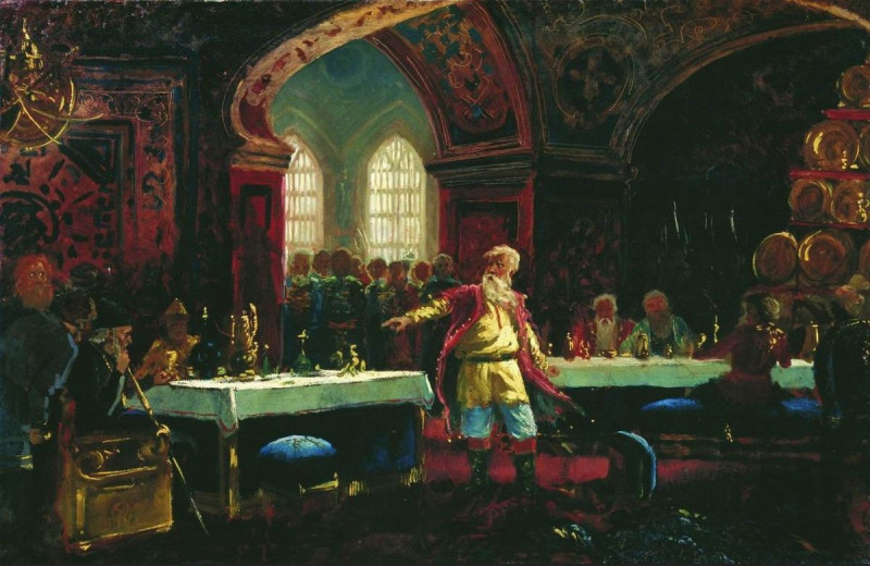 Константин Маковский (1839—1915). Князь Репнин на пиру у Ивана Грозного. Эскиз. 1860-е