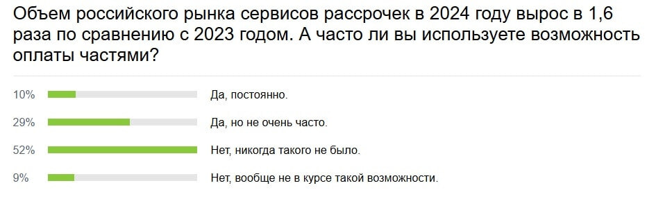 Объем российского рынка сервисов рассрочки в 2024 году вырос в 1,6 раза по сравнению с 2023-м. Мы решили поинтересоваться у хабаровчан, часто ли они пользуются возможностью оплаты частями. 52% сообщили, что никогда не пользовались такой возможностью, 29% платили частями, но происходило это редко. 10% делают так постоянно, а 9% не знали, что такая услуга есть. Отметим, что на главной странице DVHAB.ru каждую неделю проводятся опросы на самые актуальные и острые темы. Найти вы их можете, пройдя по ссылке. Напомним, ранее мы выяснили в результате опроса, что идеальный размер пенсии, по мнению хабаровчан, от 50 до 75 тысяч. Именно такую сумму хотят получать местные жители ежемесячно, чтобы обеспечить себе комфортную старость.