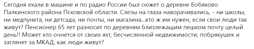 Одним словом, Замкадье - это, действительно, не Москва и на селе жить даже в настоящее время труднее, чем в городе, особенно пожилым людям. Тем не менее, хотелось бы, чтобы говоря о тех или иных проблемах в стране, критикуя те или иные явления российской жизни, люди, по возможности, включали бы мозг и подходили критично и в то же время объективно к происходящему, анализировали бы то, что им кажется негативным, с учетом объективных обстоятельств, без неуместных эмоций и стенаний.