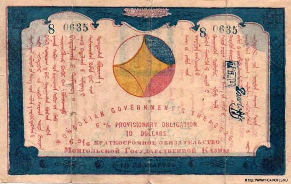 Её ввели в апреле 1921 года при бароне Унгерне.Правда, монет у этой валюты не было, а в качестве банкнот использовались казначейские 6%-ные обязательства Государственной Казны номиналом 10, 25, 50 и 100 долларов.