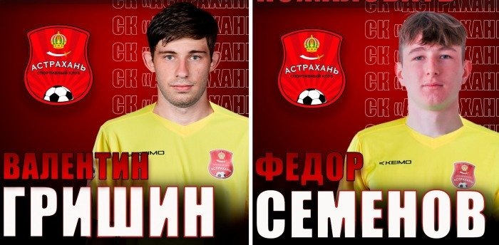 СК «Астрахань» заключил контракт с двумя молодыми голкиперами – 21 летним Валентином Гришиным и 17-летним Федором Семеновым. Уроженец Краснодара Валентин Гришин является воспитанником футбольной академии ФК «Краснодар» и выступал за юношескую сборную России U-16. На профессиональном уровне играл за «Краснодар-2» во Второй лиге дивизиона А. Всего на его счету 35 матчей. Федор Семенов родился в Астрахани и первые футбольные шаги делал в академии ФК «Волгарь». В составе «Волгаря» своего возраста провел 33 матча в ЮФЛ «Юг». Напомним, что из прошлогоднего состава клуб продлил контракт с вратарем Анатолием Красильниковым. Фото: СК «Астрахань»