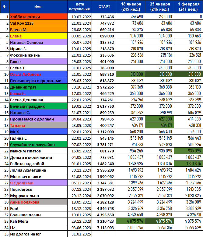 Для начала поприветствуем новеньких. На этой неделе к нам присоединились Елена Т. (номер 9 в таблице) и... (сюрприз!) Из долгов на юг (которая накануне покинула марафон для того, чтобы вернуться и обновить исходные данные)! Елена Т. честно отстояла в очереди всего лишь с ноября прошлого года (вот как быстро стала теперь продвигаться наша очередь, что не может не радовать), а Из долгов на юг вообще толком в очереди и не стояла: в первый же пост с приглашением она откликнулась, а стоявшие перед ней - нет. Также хочу обратить внимание, что у нас есть кандидат на исключение из марафона. У Ольги Лобановой уже три прогула подряд, и если в следующую перекличку она не объявится, мы будем снова освобождать место в таблице. А сейчас перейдём к основной части. Самые большие суммы погашения за неделю: Хобби и котики погасила 230000р и занимает первое место! На втором - fleurderose, которая уменьшила долг на 144314р. А так же попадает в первую тройку Случайное неслучайно: её долг уменьшился на 426